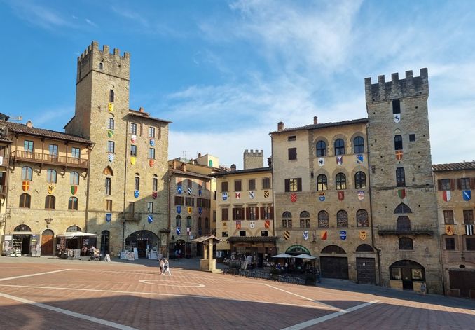 La città di Arezzo sorge su un colle all’incrocio di quattro valli: Val Tiberina, Casentino, Valdarno e Valdichiana.La città ha origini antichissime dimostra il ritrovamento di strumenti di pietra e del cosiddetto Uomo dell’Olmo del Paleolitico. Della Arretium etrusca si hanno tracce già dal IX sec. a.C. e fu una della più importanti della Toscana. Arezzo mantenne sempre un ruolo importante e di prestigio in Toscana grazie alla sua posizione lungo la Via Cassia.Molti i personaggi illustri che sono nati ad Arezzo, tra tutti Giorgio Vasari, Piero della Francesca, Guido Monaco, Francesco Redi e Petrarca.Nonostante parte della città medievale sia stata distrutta durante la Seconda Guerra Mondiale, il centro di Arezzo conserva splendidi monumenti, chiese, palazzi e musei. La Basilica di San Francesco è forse la chiesa più famosa della città. Al suo interno conserva il ciclo di affreschi della Leggenda della Vera Croce di Piero della Francesca, capolavoro rinascimentale di inestimabile valore. E poi la Fortezza Medicea, l’Anfiteatro romano e la Chiesa di San Francesco col Crocifisso ligneo di Cimabue.Arezzo ha sicuramente molto da offrire a chi la visita. Non solo la città ma anche la provincia è ricca di città, borghi e castelli che hanno svolto un ruolo importante nella storia della Toscana. Cortona, Anghiari, San Sepolcro, Poppi solo alcune delle località più belle in provincia di Arezzo che meritano di essere visitate.