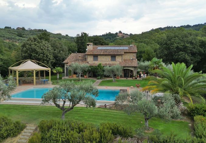 Gli esterni sono impreziositi da una splendida piscina attrezzata a sfioro (14x7m) in mosaico con chiusura della tapparella automatica, solarium in pietra, spogliatoio, bagno, doccia esterna e interna, locale tecnico e cunicolo ispezionabile, con incantevole vista sulle colline umbre, perfetta per rinfrescarsi durante le calde giornate estive.
