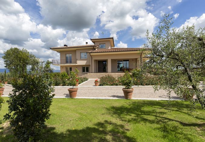 Vendesi nelle campagna toscana, in provincia di Arezzo, moderna villa di lusso con dèpendance e ampio terreno con uliveto.